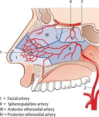 1. Facial artery 2. Maxillary artery 3. Infra-orbital artery 4. Greater palatine artery.